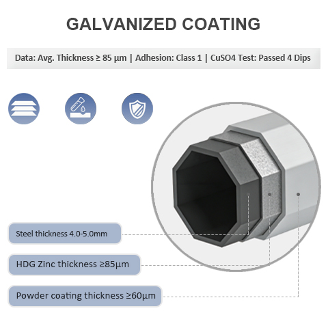 To guarantee a 25+ year lifespan without structural repainting, the column undergoes Hot Dipped Galvanizing to deposit a zinc layer of ≥85μm. This provides galvanic cathodic protection—ensuring that even if the outer ≥60μm powder coat is physically compromised by roadway debris, the underlying structural carbon steel will not suffer from sub-surface oxidation.