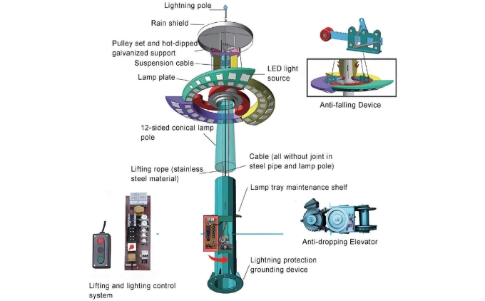 The product design integrates a multifunctional lifting system, which can be easily maintained and replaced through electric or manual control, reducing the difficulty of manual operation and improving maintenance efficiency. At the same time, the modular design of the light pole makes it easier to transport and install, and is suitable for a variety of complex sites. As a high pole lamp solution that meets modern environmental protection and safety standards, the 100ft High Mast Light Pole has the advantages of high efficiency and energy saving, easy installation and stable performance, providing customers with reliable long-term lighting services, and is an ideal choice for achieving large-scale lighting.