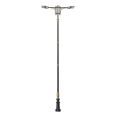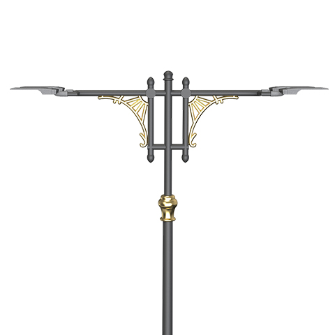 The distinctive feature of this pole is the ornate “wing-style” support bracket under the arm. Cast from aluminum and finished in gold, it adds structural elegance to the modern profile.