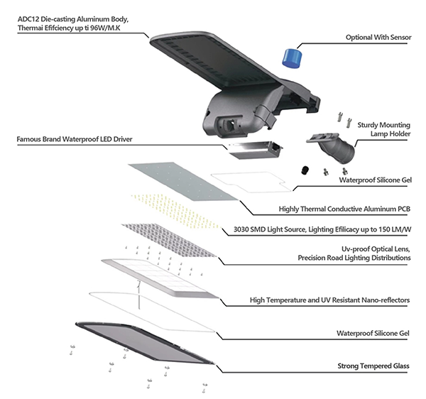 Use high thermal conductivity aluminum PCB3030 patch light source, light transmission is tempered glass, lighting efficiency is up to 150 LM/W anti-glare optical lens, with human body sensing device, lighting time is 12 hours, can be maintained for 3-5 days in rainy seasons